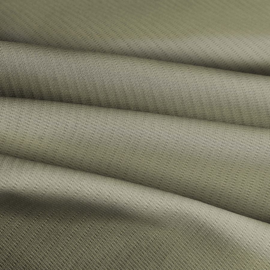 La tela base es la conocida como Tejido Técnico Transpirable - Fresh, un tejido técnico de poliéster de 135 gr/m2 y 150 cm de ancho. El color liso impreso es un verde camuflaje con un CMYK de 32 24 48 7, lo que indica que la tinta predominante es la amarilla seguida de la cian. El color secundario, el verde, es profundo y evocador de la naturaleza, combinando a la perfección con tonos neutros como el blanco y el gris, o con colores tierra.