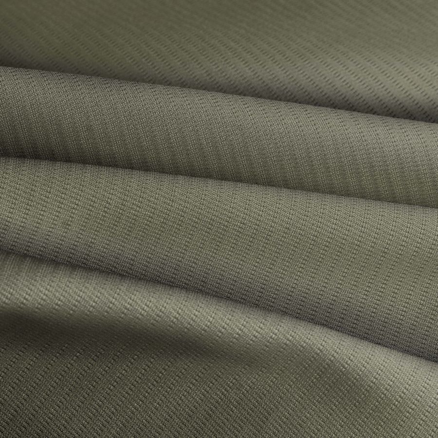 La tela base, Tejido Técnico Transpirable - Fresh, está compuesta al 100% de poliéster. Su gramaje es de 135 gr/m2 y su ancho es de 150 cm. Es un tejido técnico transpirable con acabado elástico y una textura suave al tacto. El color liso impreso en la tela base es Marrón/Verde Ejército, con una combinación de los siguientes porcentajes de tinta: 56% Cian, 45% Magenta, 64% Amarillo y 40% Negro, lo que da como resultado un tono terroso y militar. El color secundario, Verde Ejército, representa la fuerza, la seguridad y la estabilidad, aportando una sensación de armonía y equilibrio en la quietud de la naturaleza.