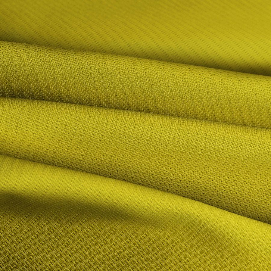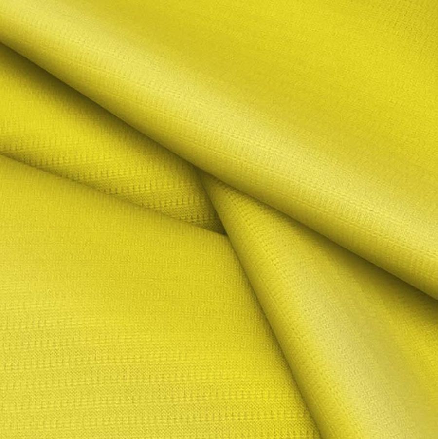 La tela base de este tejido técnico de poliéster, conocido como Fresh, tiene un gramaje de 135 gr/m2, con una anchura de 150 cm. Se trata de una tela transpirable que proporciona un tacto elástico. En cuanto al color, el mismo se presenta en tonos amarillo y dorado, con un contenido de tinta de 7 de cyan, 9 de magenta, 89 de yellow y 0 de black. El color liso impreso es a una sola cara por impresión digital textil.