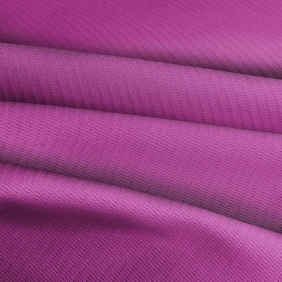 La tela base es un tejido técnico transpirable llamado Fresh, con una composición 100% poliéster, un gramaje de 135 gr/m2 y una anchura de 150 cm. El color liso impreso es un morado ciruela rosa, con una tinta Cyan de 38, tinta Magenta de 87, tinta Yellow de 2 y tinta Black de 0, lo que conforma un CMYK de 38 87 2 0. Este color secundario se describe como un tono intenso y profundo de rosa, con un toque de violeta que le brinda una apariencia ligeramente más sobria. El color combina bien con colores neutros como el gris y el blanco, así como con tonos alegres y vivos como el amarillo y el naranja.