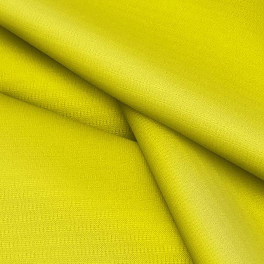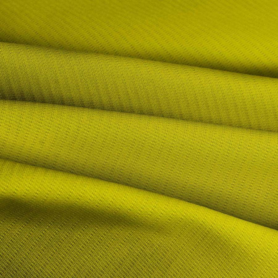 El Tejido Técnico Transpirable Fresh es un tipo de tela técnica compuesto por 100% poliéster con un gramaje de 135 gr/m2 y un ancho de 150 cm. Su color liso impreso es un amarillo dorado con una tinta cyan del 12, tinta magenta del 3, tinta Yellow del 93 y sin tinta Black, lo que se traduce en un CMYK de 12 3 93 0. Este color secundario simboliza la frescura, la luminosidad y la positividad. Su carácter alegre se combina perfectamente con otros tonos cálidos como el naranja y el rojo, pero también con tonalidades frías como el verde y el azul.