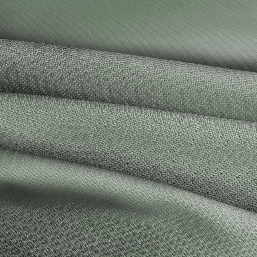 La tela base es el Tejido Técnico Transpirable - Fresh, de composición 100% poliéster, con un gramaje de 135 gr/m2 y un ancho de 150 cm. El color liso impreso es un verde camuflaje que se ha obtenido con la técnica de sublimación utilizando las tintas cian, magenta, amarillo y negro en una proporción en CMYK de 54 34 50 18. El color secundario es un degradado de tonalidades verdes, que evoca a la naturaleza. Combina muy bien con tonos tierra y marrones, así como con tonos oscuros como el negro.