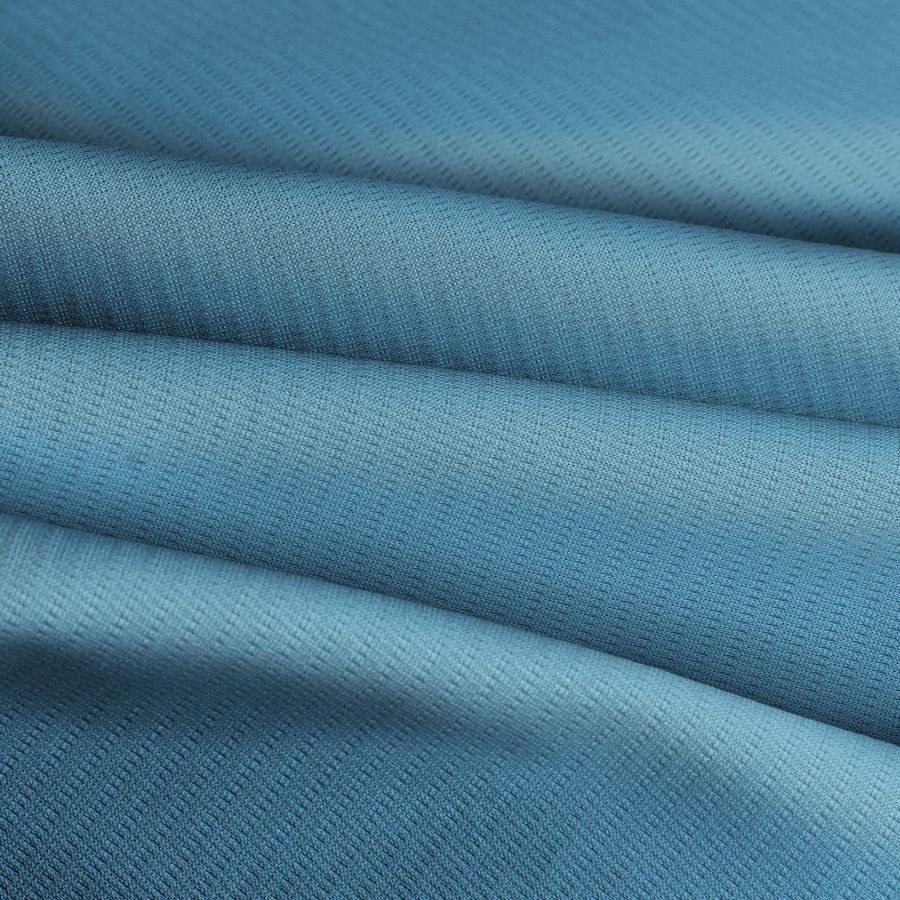 La tela base es un tejido técnico transpirable llamado Fresh, compuesto al 100% de poliéster, con un gramaje de 135 gr/m2 y un ancho de 150 cm. El color liso impreso es Azul Iceberg con las siguientes tintas: Cyan 59, Magenta 14, Yellow 4 y Black 0, lo que resulta en un CMYK de 59 14 4 0. El color Azul Iceberg es un tono frío que evoca la sensación fresca y nítida del hielo. Se combina muy bien con los colores blancos, grises y verdes, creando un ambiente fresco y relajante.