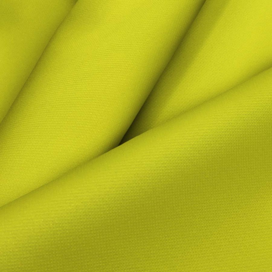 La tela base es la Tela Cortavientos Impermeable - Target, un tejido técnico con composición 100% poliéster, 116 gr/m2 de gramaje y 145 cm de ancho. El color liso impreso corresponde a un tono verde ácido, con una combinación de tintas de 31% de cyan, 13% de magenta, 96% de yellow y 2% de black (CMYK: 31 13 96 2). Este color secundario se asemeja a un verde fluorescente, vibrante y moderno, que resalta por su alegría y energía. Se combina especialmente bien con tonos neutros, como grises y blancos, así como con azules y rosas para crear contrastes. Es importante destacar que la tela está impresa a una sola cara mediante impresión digital textil, lo que significa que el color solo está presente en una cara del tejido.