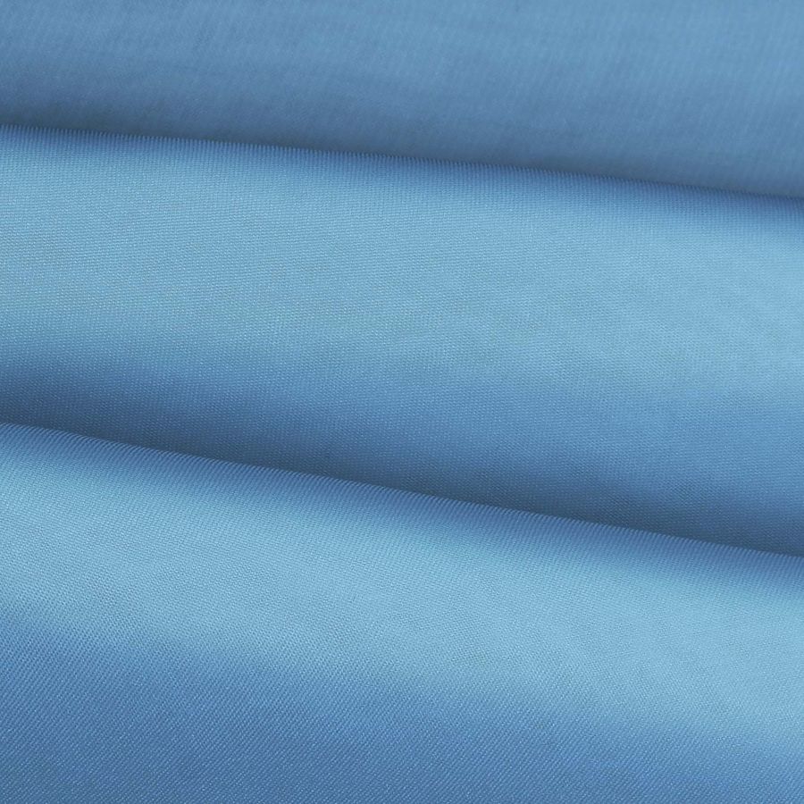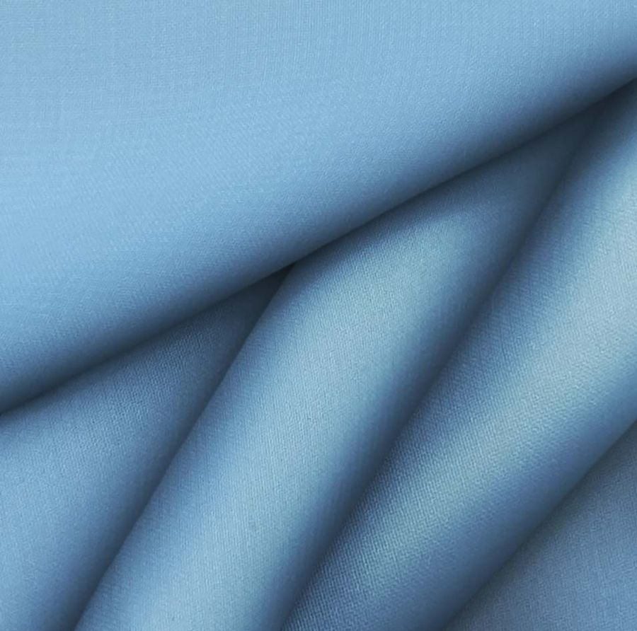 La tela base de la que hablamos es la Gasa Transparente - Salamanca, con una composición del 100% de poliéster y un gramaje de 28 gr/m2. El color liso impreso es de un azul seda, con un contenido del CMYK de 67 36 6 0. Este color ofrece un simbolismo de honestidad y tranquilidad, y técnica mente se podría decir que su tonalidad cercana al cian y al magenta lo hacen un tono frío, aunque con cierto grado de calidez en su tono. Este color combina particularmente bien con tonos beige, neutros, plateados, dorados y hasta con tonos mas saturados como el naranja o el fucsia. Cabe destacar que la tela está impresa con el color liso a una sola cara por impresión digital textil, lo que significa que no es un tejido tintado sino impreso por una sola cara.