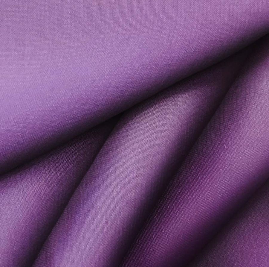La tela base es la Gasa Transparente - Salamanca, hecha 100% de poliéster y con un gramaje de 28 gr/m2. Su ancho es de 150 cm y su color liso impreso presenta un tono morado oscuro con un CMYK de 66 87 22 9. Este color secundario, creado por la mezcla de las tintas cian, magenta, yellow y black, representa la creatividad, sabiduría e intuición. Además, combina perfectamente con tonos verdes y amarillos.