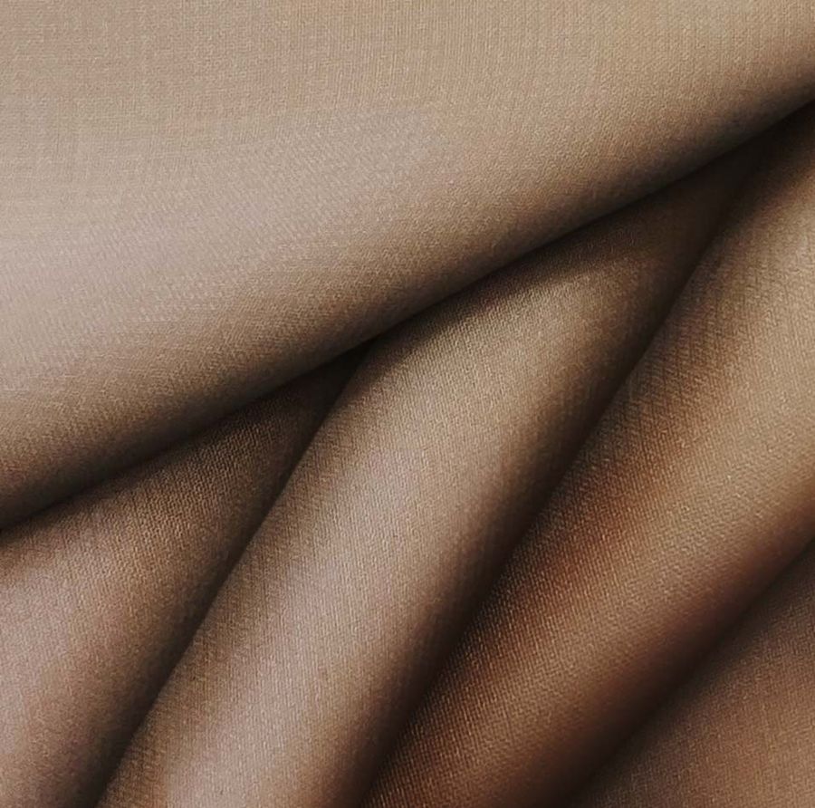 La tela base es Gasa Transparente - Salamanca, compuesta por 100% poliéster, con un ancho de 150 cm y un gramaje de 28 gr/m2. El color liso impreso es un Marrón Oso Café, con un contenido de tinta Cyan de 35, Magenta de 55, Yellow de 66 y Black de 37 (CMYK: 35 55 66 37). Este color secundario se asocia con la madera, la tierra y la naturaleza, resultando ser cálido y acogedor. Combina bien con otros colores terrosos, como el verde oliva o el amarillo mostaza. Además, al imprimirse a una sola cara por impresión digital textil, se pueden utilizar en diseños con efectos ópticos que aprovechen las posibilidades de su transparencia.