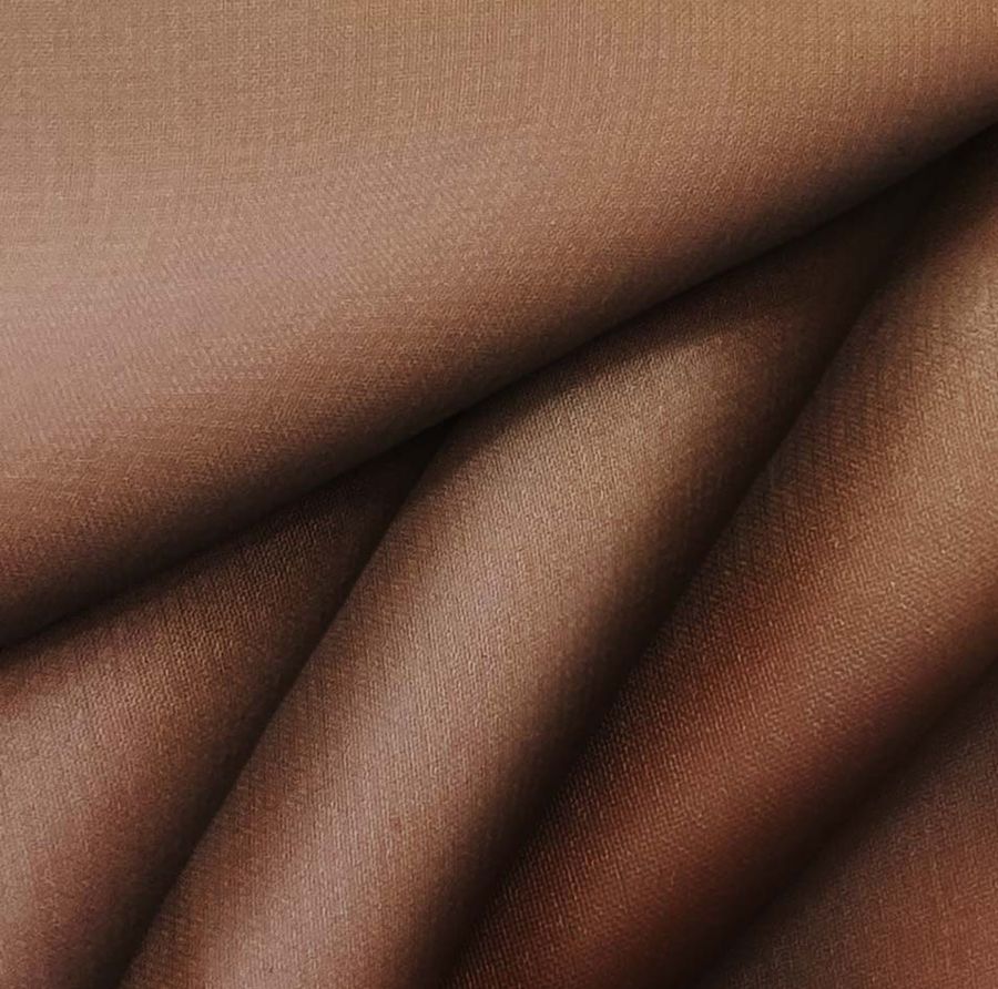 La tela base es la Gasa Transparente - Salamanca, de 100% poliéster, con un gramaje de 28 gr/m2 y un ancho de 150 cm. El color liso impreso es Marrón Panaderos, con una combinación de tinta cyan de 36, magenta de 72, amarilla de 82 y negra de 51, lo que da un CMYK de 36 72 82 51. Este color panaderos marrón es un tono cálido que se asocia con la tierra, la madera o el cacao, comunica confianza y seriedad y combina bien con tonos anaranjados y amarillentos, colores neutros, y tonalidades más claras como beige o crema.
