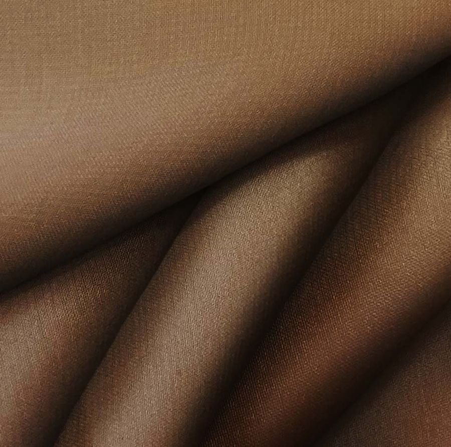 La tela base de esta prenda es la Gasa Transparente - Salamanca, un tejido ligero y transparente compuesto en un 100% de poliéster con un gramaje de 28 gr/m2 y un ancho de 150 cm. El color liso impreso es de un tono marrón chocolate con leche, cuyo CMYK es de 42 73 93 62. Este color transmite una sensación de calidez, acogedora e intensa, que recuerda al chocolate con leche. Además, se combina muy bien con tonos neutros, beiges, grises y negros. Es importante destacar que este tejido está impreso a una sola cara mediante impresión digital textil, lo que significa que el color solo está presente en una cara y no es un tejido tintado.