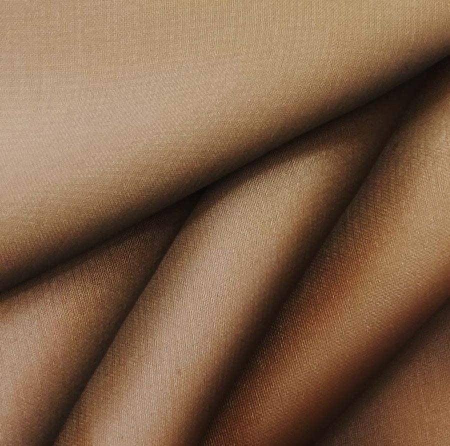 La mezcla de cian, magenta, amarillo y negro que forma este color secundario crea un tono marrón neutral y oscuro, lo que lo hace versátil y fácil de combinar con otros colores. En particular, combina bien con tonos tierra como el verde oliva o marrón claro. La tela base tiene una textura visual transparente y una textura delgada al tacto.