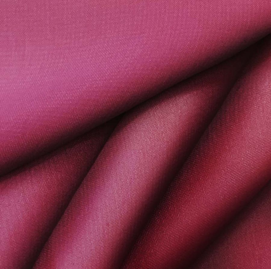 Las características de la tela base son su textura visual transparente y su textura de tacto delgado, lo que la hace muy ligera y cómoda al contacto con la piel. En cuanto al color liso impreso, el granate púrpura intenso aporta elegancia y sofisticación a cualquier prenda que se confeccione con ella.