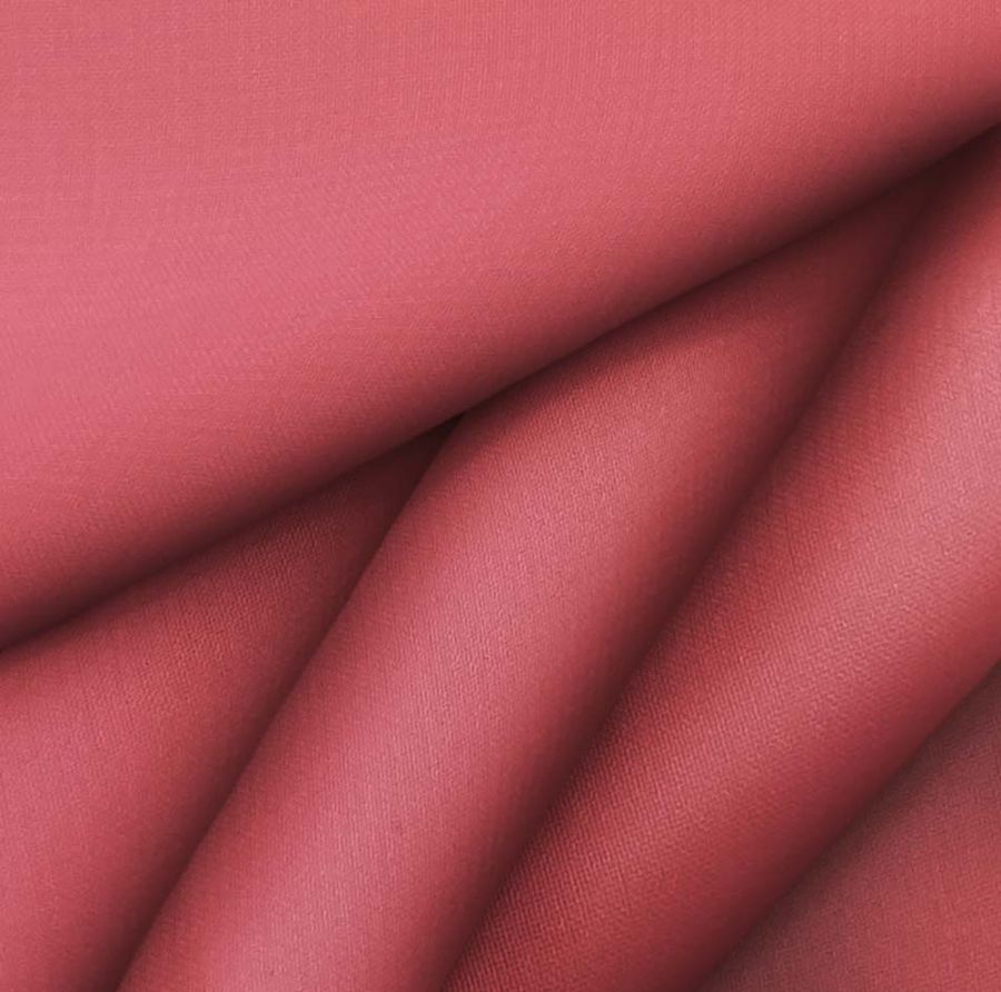 La tela base, Gasa Transparente - Salamanca, es una gasa 100% poliéster con un gramaje de 28 gr/m2 y un ancho de 150 cm. El color liso impreso en esta tela es Rojo Carbón, compuesto por una combinación de 16% de tinta cian, 87% de tinta magenta, 67% de tinta amarilla y 6% de tinta negra (CMYK: 16 87 67 6). Este color secundario tiene un matiz oscuro con matices rojizos, lo que sugiere fuerza y emoción. Combina muy bien con tonos neutros como el blanco, negro y gris, así como con otros colores cálidos y profundos como el marrón y el verde oscuro.