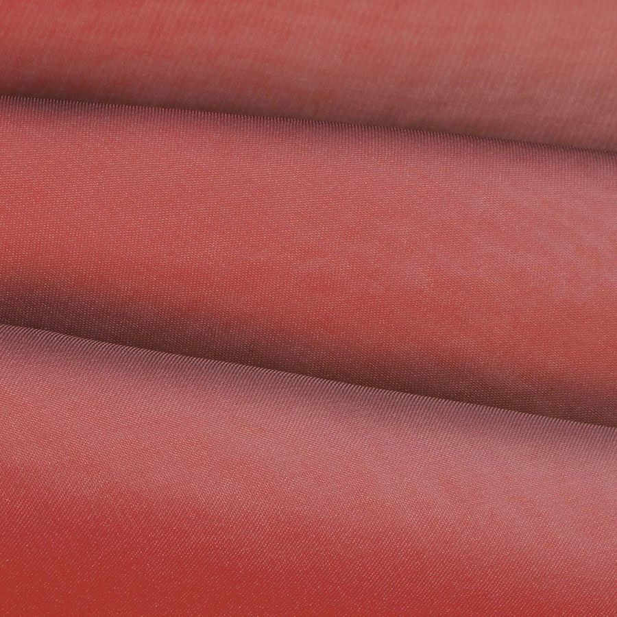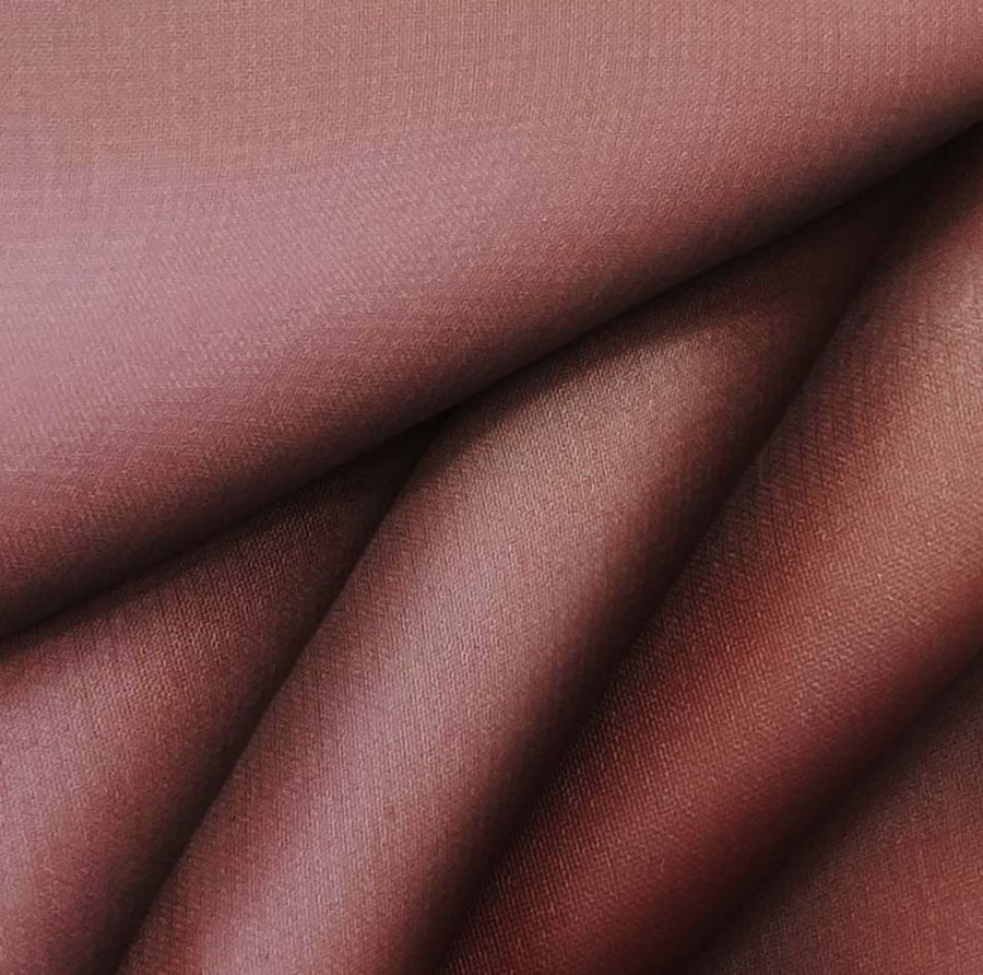 La tela base de este tejido es una gasa transparente de 100% poliéster con un gramaje de 28 gr/m2 y un ancho de 150 cm. El color liso impreso es un marrón con un toque de sangre roja. El CMYK del color es 34 77 67 44. Este color secundario simboliza la fuerza, el poder y la pasión. Combina bien con otros colores tierra, como el beige y el naranja claro. La tela está impresa con el color liso en una sola cara por impresión digital textil.