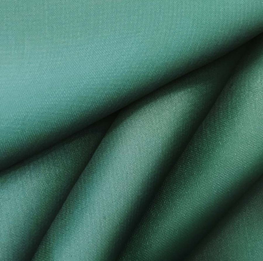 La tela base es Gasa Transparente - Salamanca, de composición 100% poliéster, con un gramaje de 28 gr/m2 y un ancho de 150 cm. Esta tela se caracteriza por ser visualmente transparente y tener un tacto delicado y suave. El color impreso es un verde profundo con tonalidades de verde mar, con un CMYK de 80 37 65 31. Este color se combina especialmente bien con tonalidades cremas, blancas, grises y doradas, creando una sensación de elegancia y sofisticación. La tela está impresa con este color liso a una sola cara por impresión digital textil.