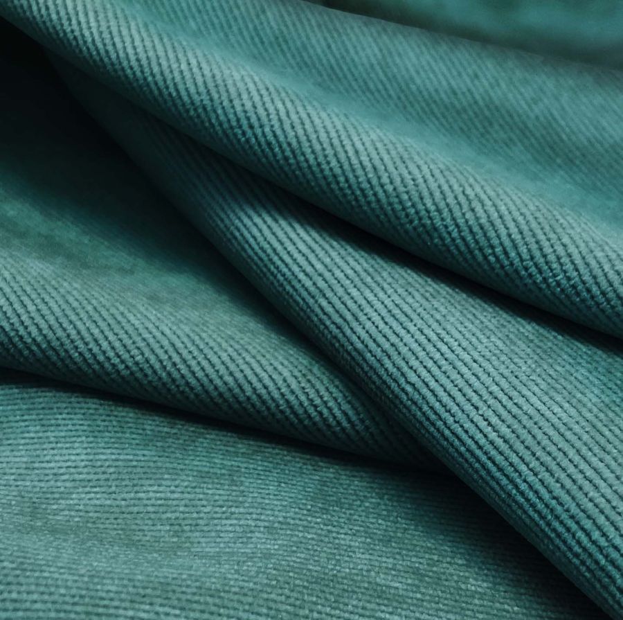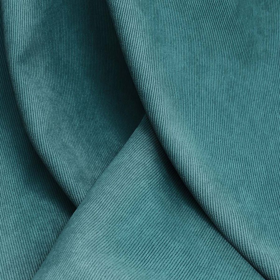 La tela base, Pana Aterciopelada - Dublin, tiene una composición de 85% poliéster, 12% poliamida y 3% elastano. Su gramaje es de 280 gr/m2 y su ancho de 150 cm. El color liso impreso es una mezcla de azul y verde azulado medio, con un CMYK de 80 40 47 29. Este color secundario tiene un efecto relajante y calmante, sugiere estabilidad y armonía. Combina muy bien con tonos tierra, beige, gris, blanco, plateado y dorado.