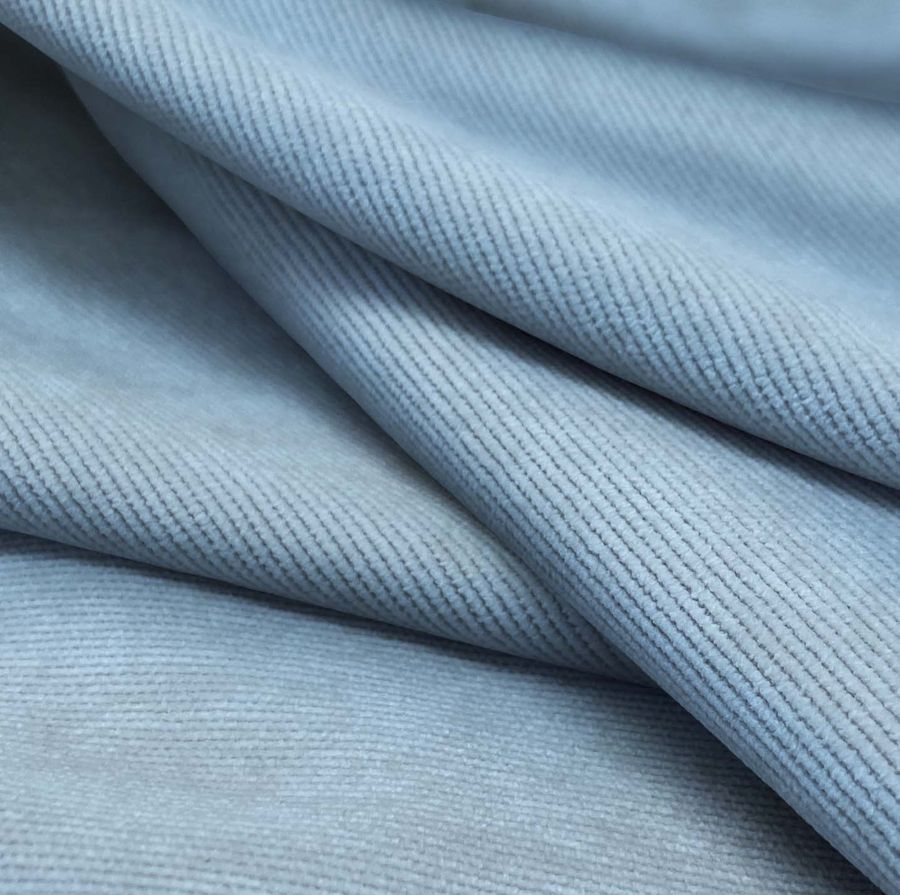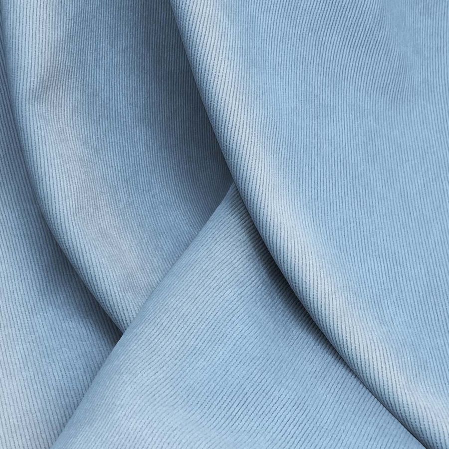 La tela base es una Pana Aterciopelada - Dublin, con una composición de 85% POLIÉSTER, 12% POLIAMIDA y 3% ELASTANO. El color liso impreso es un hermoso Azul seda, con un CMYK de 51 23 5 0. Este color se describe como un tono azul claro, suave y elegante, que combina perfectamente con tonos crudos, grisáceos y verdes pastel.