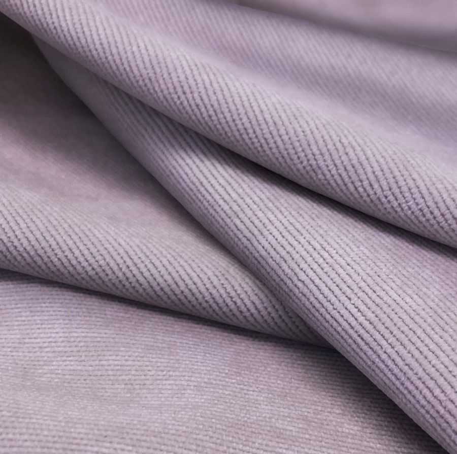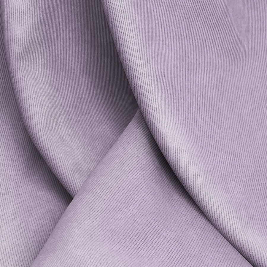 La tela base es la Pana Aterciopelada - Dublin, con un compuesto de 85% poliéster, 12% poliamida y 3% elastano, que aportan un gramaje de 280 gr/m2 y un ancho de 150 cm. El color liso impreso en el tejido es un morado lavanda púrpura, con una mezcla de tintas cian, magenta, amarillo y negro que se reflejan en el CMYK 35 41 13 1. Este color simboliza la espiritualidad, la realeza y la creatividad, y su brillo y suavidad contrastan con la textura de la tela base. Además, el morado lavanda púrpura combina especialmente bien con tonos verdes, grises y azulados.