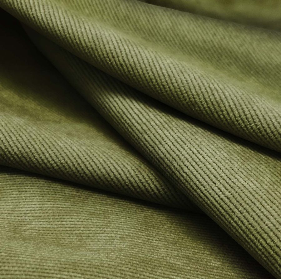 La tela base es una Pana Aterciopelada - Dublin, compuesta por un 85% de poliéster, un 12% de poliamida y un 3% de elastano. Su gramaje es de 280 gr/m2 y su ancho de 150 cm. El color liso impreso en la tela es una combinación de verde y bronce antiguo, con los siguientes valores CMYK: 59 43 81 37. Este color tiene una textura visual brillante y aporta suavidad al tacto de la tela. Se combina especialmente bien con tonos neutros y colores tierra.