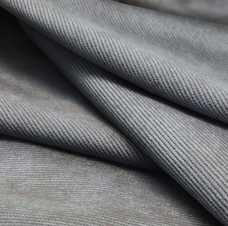 La tela base de este tejido es la Pana Aterciopelada - Dublin, con una composición del 85% poliéster, 12% poliamida y 3% elastano, un gramaje de 280 gr/m2 y un ancho de 150 cm. El color liso impreso es un gris pizarra, con un CMYK de 56 44 36 21 y una textura visual brillante. Combina especialmente bien con otros tonos grises, negros y blancos. La tela está impresa a una sola cara por impresión digital textil.