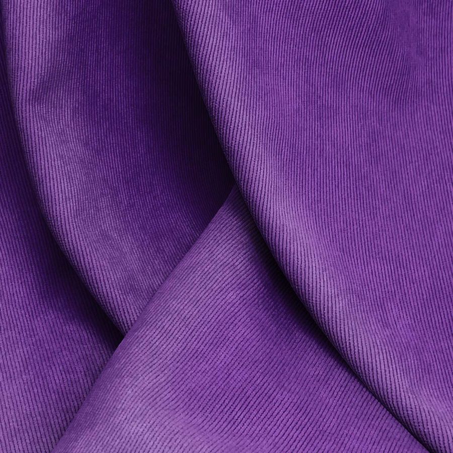 La tela base es la Pana Aterciopelada - Dublin, compuesta por 85% de poliéster, 12% de poliamida y 3% de elastano, con un gramaje de 280 gr/m2 y un ancho de 150 cm. El color liso impreso es Morado, Índigo, Iris Morado, con un CMYK de 82 100 11 3, lo que le aporta una textura visual brillante y un tacto suave. El color secundario es un tono púrpura suave y misterioso, que representa la espiritualidad, la sabiduría y la intuición. Combina especialmente con tonos grises, azules y verdes, proporcionando elegancia y sofisticación. La tela está impresa con el color liso a una sola cara por impresión digital textil, lo que permite una alta resolución y una gran variedad de diseños.