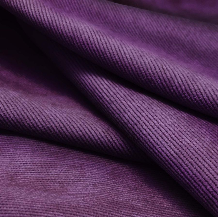 La tela base de este tejido es la Pana Aterciopelada - Dublin, compuesta por 85% de poliéster, 12% de poliamida y 3% de elastano, con un gramaje de 280 gr/m2 y un ancho de 150 cm. El color liso impreso es Morado oscuro con un CMYK de 81 100 32 30. Este color es profundo y elegante, simboliza la creatividad, la nobleza y la espiritualidad. Combina perfectamente con tonos grises y verdes oscuros.