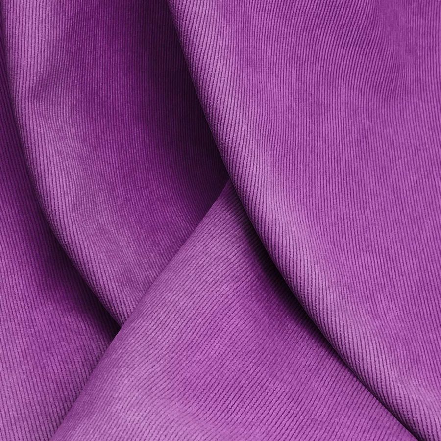 La tela base es la Pana Aterciopelada - Dublin, con una composición de 85% POLIÉSTER, 12% POLIAMIDA y 3% ELASTANO, un gramaje de 280 gr/m2 y un ancho de 150 cm. El color liso impreso es un morado intenso con flores de color púrpura, representado por un CMYK de 56 89 2 0, lo que indica una alta proporción de magenta y una presencia moderada de cyan y amarillo. Dicho color combina muy bien con verdes oscuros, beiges y grises, lo que lo hace ideal para ambientes serenos y cálidos.