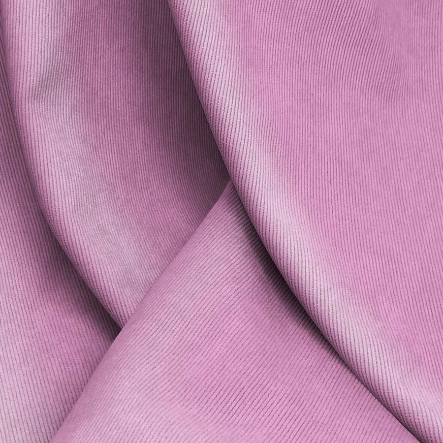 La tela base es la Pana Aterciopelada - Dublin, compuesta por un 85% de poliéster, un 12% de poliamida y un 3% de elastano. Tiene una textura suave y brillante, y un peso de 280 gr/m2 con un ancho de 150 cm. El color liso impreso es el Rosa Cadillac, con los siguientes valores de tinta: Cyan 18, Magenta 57, Yellow 4 y Black 0, lo que se traduce en un CMYK de 18 57 4 0. El color secundario es una variación del rosa pastel, que aporta dulzura y sencillez a la tela. Combina especialmente bien con tonos neutros como blancos, cremas y grises, pero también se puede usar con tonos más fuertes como el verde o el turquesa, creando un efecto armonioso y primaveral.