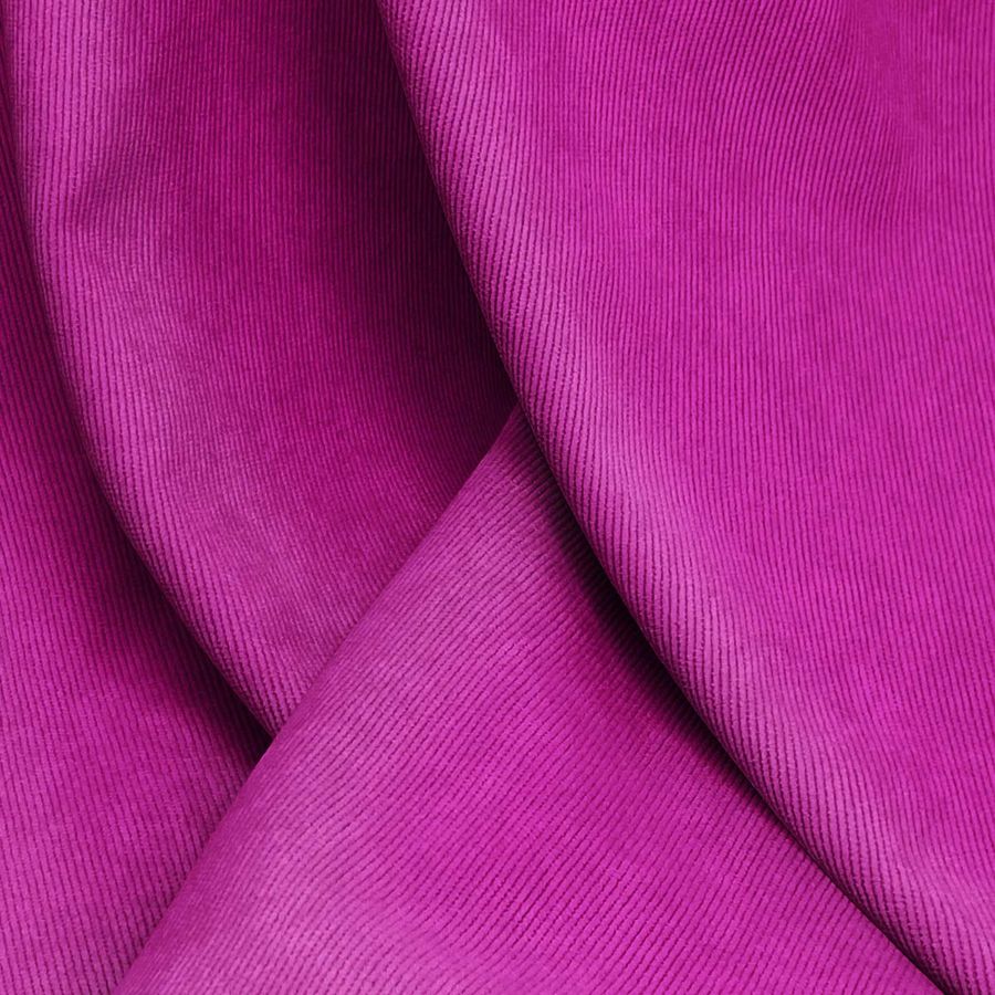 La tela base de esta prenda es la Pana Aterciopelada Dublin, compuesta por 85% poliéster, 12% poliamida y 3% elastano, con un gramaje de 280 gr/m2 y un ancho de 150 cm. El color liso impreso tiene un tono morado y ciruela rosa, con un CMYK de 35 100 1 1. Este color secundario es vibrante y sofisticado, combina muy bien con tonos neutros como el gris o el beige, así como con tonos más atrevidos, como el turquesa o el naranja.