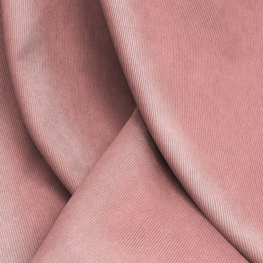 La tela base es la Pana Aterciopelada - Dublin, compuesta por un 85% de poliéster, un 12% de poliamida y un 3% de elastano, con un gramaje de 280 gr/m2 y un ancho de 150 cm. Su color liso impreso es un rosa margarita con valores de CMYK de 14 53 40 3. Este color secundario tiene un toque suave y brillante que refleja la delicadeza de las flores que inspiran su nombre. Complementa a la perfección con otros colores pastel como el verde claro, el celeste, el gris claro y el blanco. Es importante señalar que la tela está impresa con el color liso a una sola cara por impresión digital textil, lo que significa que no es un tejido tintado sino impreso por una sola cara con crecimiento mínimo del diseño hacia el dorso.