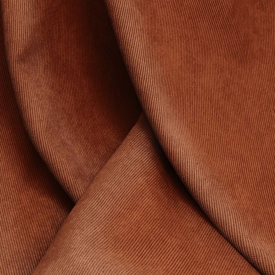 La tela base es la Pana Aterciopelada - Dublin, con una composición de 85% poliéster, 12% poliamida y 3% elastano. Su color liso impreso es una combinación de marrón y granate, con un CMYK de 33 84 98 46. Este color secundario presenta un tono oscuro y cálido, que se combina bien con colores como el beige, el verde oliva y el dorado.