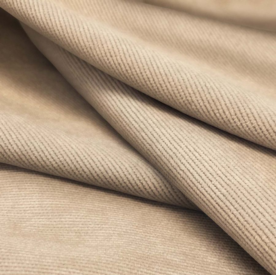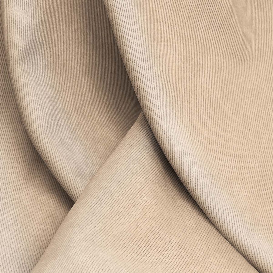 La tela base es la Pana Aterciopelada - Dublin, con una composición de 85% poliéster, 12% poliamida y 3% elastano, un gramaje de 280 gr/m2 y un ancho de 150 cm. El color liso impreso es Naranja Cantalupo, con un CMYK de 9 27 39 1. Este color se presenta como un tono vibrante, que transmite fuerza y creatividad. Simbólicamente, el naranja representa entusiasmo, energía y vitalidad, se combina con otros colores cálidos como el marrón o el amarillo para crear un ambiente acogedor y se asocia a menudo con la renovación y la transformación.