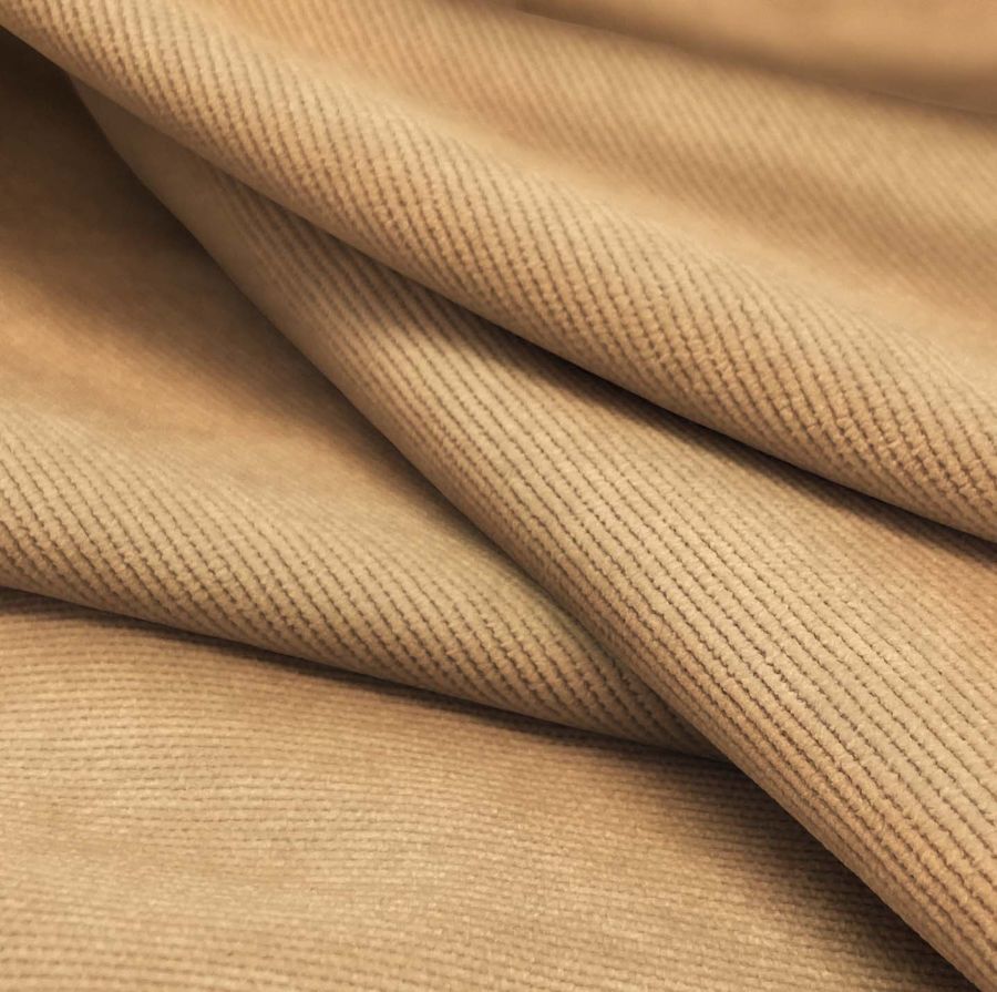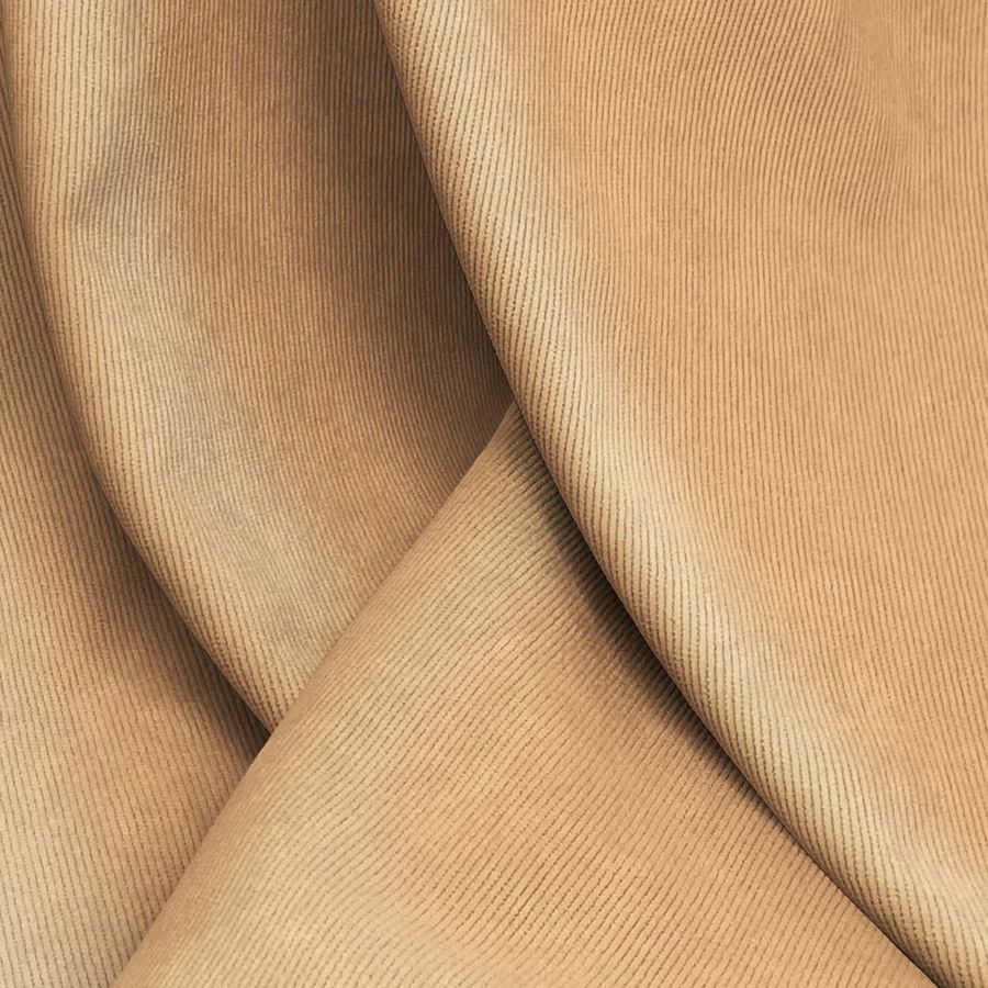 La tela base es la Pana Aterciopelada - Dublin, con una composición de 85% poliéster, 12% poliamida y 3% elastano, un gramaje de 280 gr/m2 y un ancho de 150 cm. El color liso impreso es un Naranja Cantalupo con un CMYK de 11 41 59 2. Este color secundario evoca la naturaleza, la calidez, la energía y la vitalidad. Se combina particularmente bien con tonos neutros como el gris o el blanco, así como con tonos análogos como el amarillo, el rojo o el marrón.