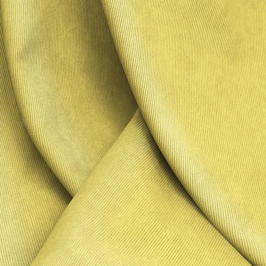 La tela base es Pana Aterciopelada - Dublin, compuesta por 85% poliéster, 12% poliamida y 3% elastano con un gramaje de 280 gr/m2 y un ancho de 150 cm. El color liso impreso es Amarillo Mostaza, con un CMYK de 6 11 70 0. Este color se presenta como un tono cálido y vibrante que combina perfectamente con colores neutros como blanco, beige y marrón, así como con tonos de azul, verde y rosa.