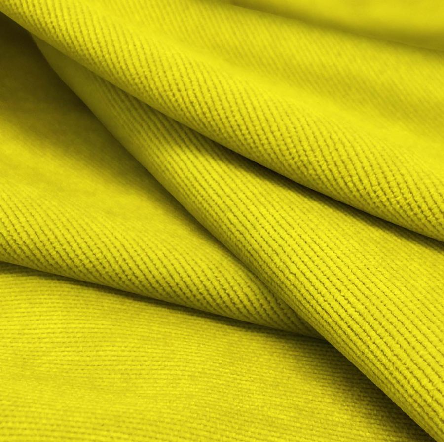 La tela base, Pana Aterciopelada - Dublin, es una pana compuesta por 85% poliéster, 12% poliamida y 3% elastano, con un gramaje de 280 gr/m2 y un ancho de 150cm. El color liso impreso en la tela es Amarillo Canario, con una combinación de tintas Cyan 6, Magenta 0, Yellow 89 y Black 0, con un resultado de CMYK 6 0 89 0. El color es brillante y genera una textura suave y visual. Combina especialmente con tonos marrones, verdes y naranjas, brindando un aspecto fresco y luminoso.