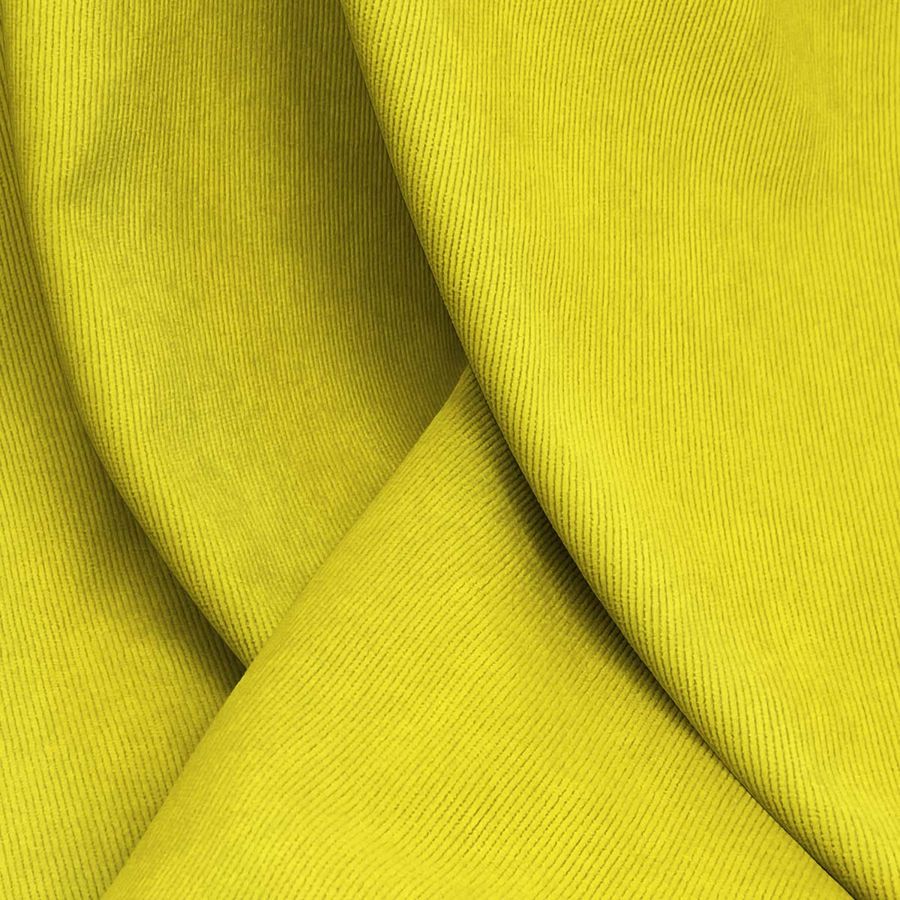 La tela base es una Pana Aterciopelada - Dublin, compuesta por 85% poliéster, 12% poliamida y 3% elastano. Su gramaje de 280 gr/m2 y un ancho de 150 cm la hacen ideal para tapizados, moda y decoración. El color liso impreso es un amarillo canario con un CMYK de 11 9 90 0, lo que le otorga un tono brillante y vibrante. Combina bien con otros colores como el verde oscuro, el azul marino y el gris. La tela está impresa con el color liso a una sola cara por impresión digital textil.