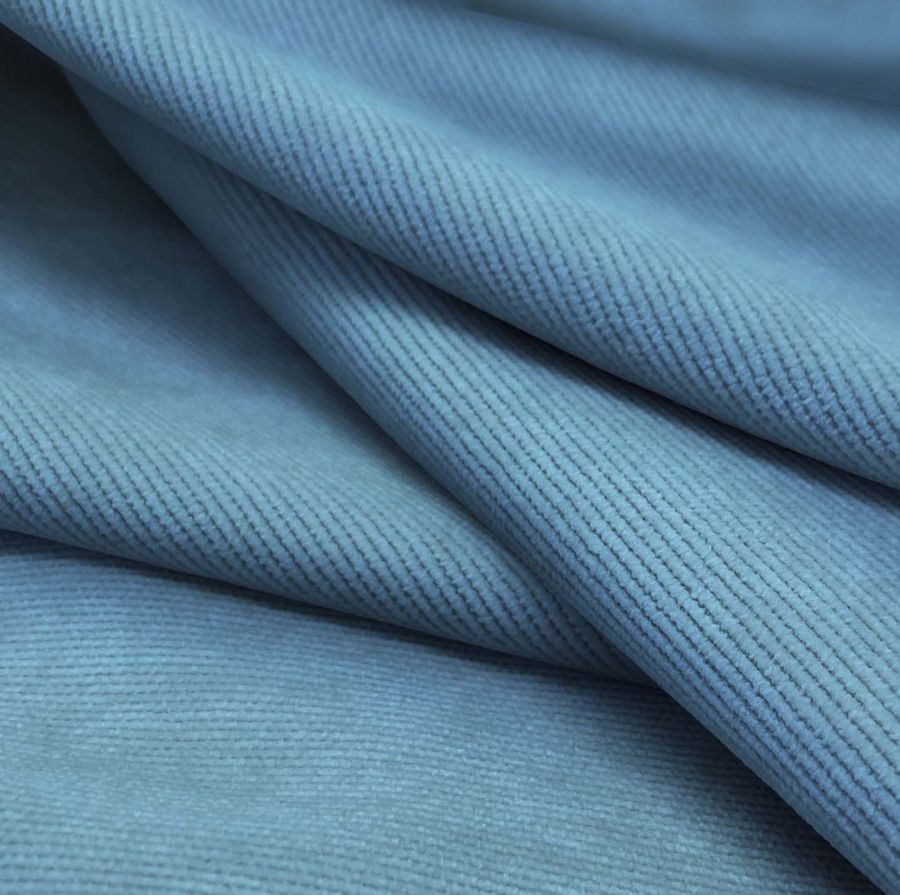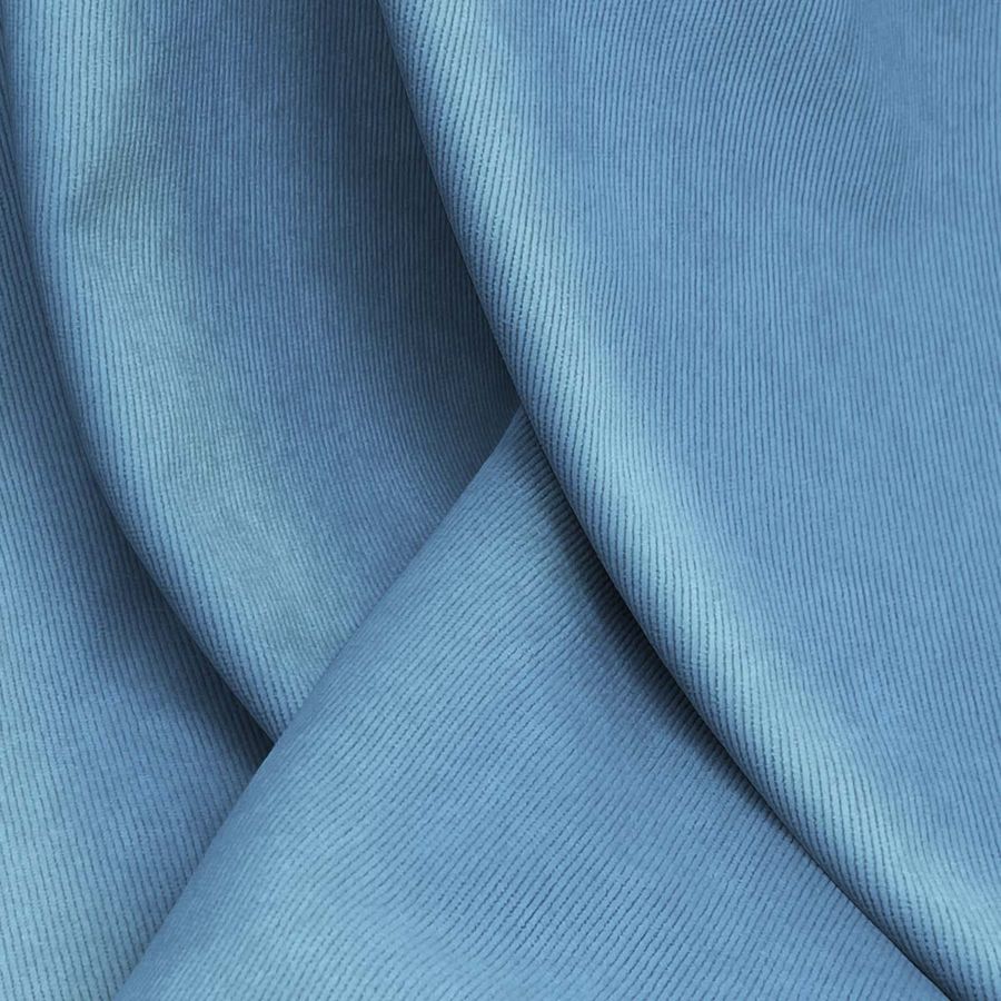 La tela base es la Pana Aterciopelada - Dublin, compuesta por 85% de poliéster, 12% de poliamida y 3% de elastano, con un gramaje de 280 gr/m2 y un ancho de 150 cm. El color liso impreso es un tono azul combinado con SteelBlue, con una tinta Cyan del 67%, Magenta del 39%, Yellow del 15% y Black del 2%, lo que da como resultado un color vivo y brillante. Este color combina perfectamente con colores como el blanco, negro, gris oscuro y beige claro. Es importante mencionar que la tela está impresa con el color liso a una sola cara por impresión digital textil.
