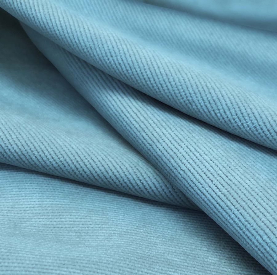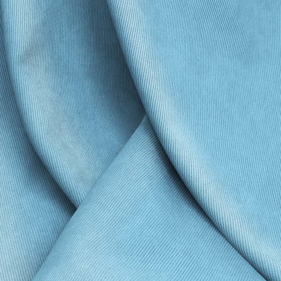 La tela base de este tejido es la Pana Aterciopelada - Dublin, compuesta por 85% poliéster, 12% poliamida y 3% elastano, con un gramaje de 280 gr/m2 y un ancho de 150 cm. Este tejido es suave y visualmente brillante. El color impreso es Azul Iceberg, con un CMYK de 56 13 6 0, una combinación de tonos fríos que evoca una sensación de calma y serenidad. Este color combina particularmente bien con tonos blancos, grises y beiges, creando una sensación de equilibrio y sofisticación. La tela está impresa a una sola cara por impresión digital textil.