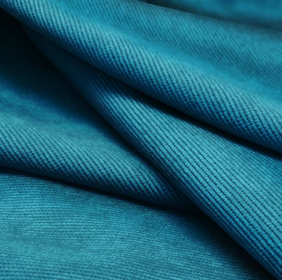 La tela base de este tejido es la Pana Aterciopelada - Dublin, compuesta por 85% de poliéster, 12% de poliamida y 3% de elastano, con un gramaje de 280 gr/m2 y un ancho de 150 cm. Su color liso impreso es un tono azul claro con los ojos azules, representado por el CMYK de 89 48 29 13. Este color se presenta como un tono llamativo y vibrante, combinable con otros tonos fríos como el blanco o gris, pero incluso también con tonos más cálidos como el rosa palo o el amarillo claro.