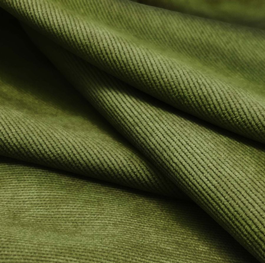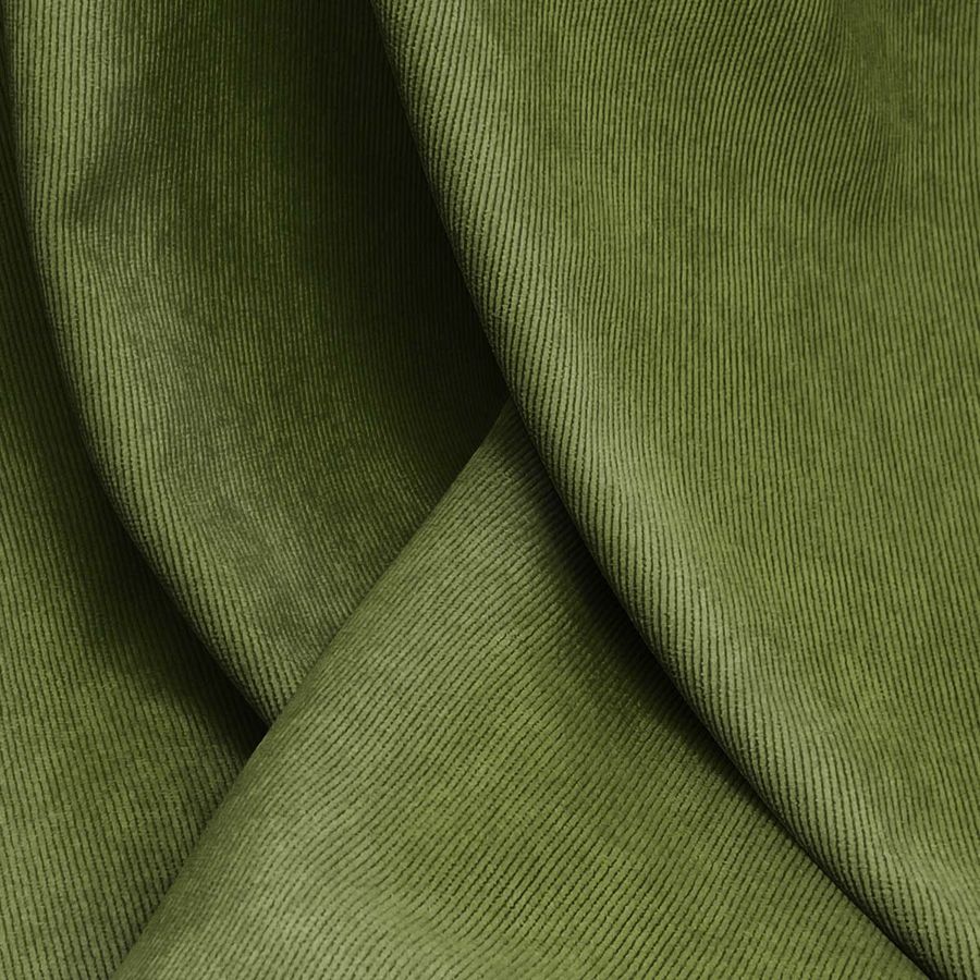 La tela base de la Pana Aterciopelada - Dublin es de tipo pana con una composición de 85% de poliéster, 12% de poliamida y 3% de elastano, lo que le confiere una textura suave y un brillo visual intenso. El color liso impreso tiene una tonalidad verde ejército, con un CMYK de 67 46 100 46, que le aporta un aspecto elegante y distinguido. El verde ejército es un color secundario que combina perfectamente con tonalidades neutras como el blanco, el negro y el gris, y también con colores marrones y dorados, tonos anaranjados y rosados suaves.