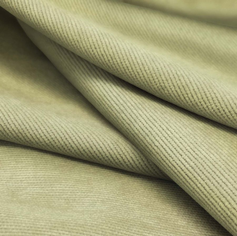 El color liso impreso en la pana es un verde oliva con un CMYK de 31, 18, 56, 3. Es decir, está compuesto por una mezcla de cian, magenta, amarillo y negro con una predominancia de amarillo y algo de cian. Este color combina muy bien con tonos neutros como el beige o el gris, y también con otros verdes más vibrantes. Cabe destacar que el tejido está impreso con el color liso a una sola cara por impresión digital textil, sin que haya una tinta que penetre por completo la tela, sino que se queda en la superficie para crear una capa de impresión impermeable.