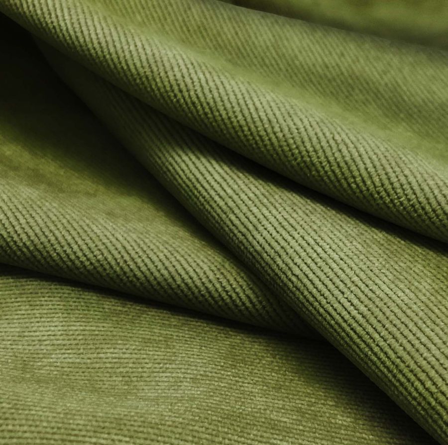 La tela base de este tejido es la Pana Aterciopelada - Dublin, con una composición de 85% poliéster, 12% poliamida y 3% elastano. Su gramaje es de 280 gr/m2 y tiene un ancho de 150 cm. El color liso impreso en esta tela es un verde ejército, con una tinta cyan de 62, magenta de 41, yellow de 88 y black de 34, lo que se traduce en un CMYK de 62 41 88 34.