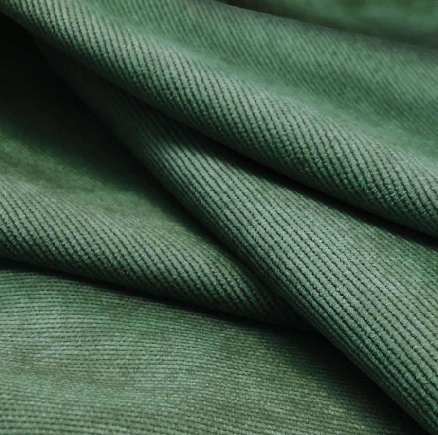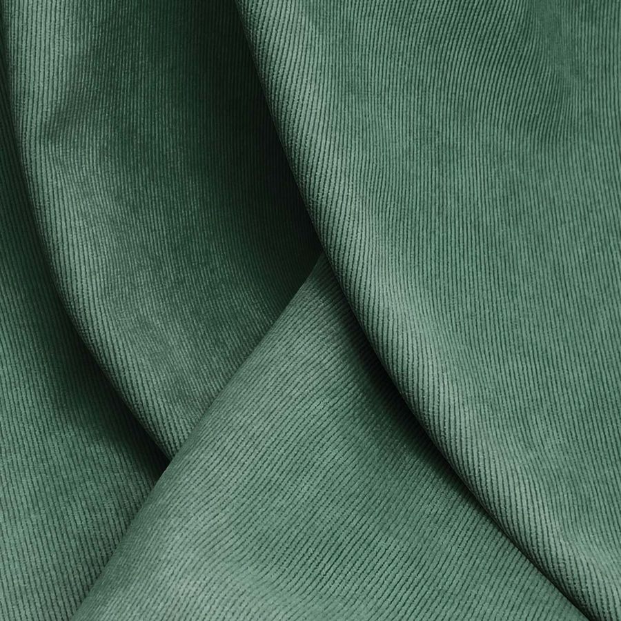 La tela base es la Pana Aterciopelada - Dublin, compuesta por 85% POLIÉSTER, 12% POLIAMIDA, 3% ELASTANO, con un gramaje de 280 gr/m2 y un ancho de 150 cm. El color liso impreso es un verde mar profundo, cuyo CMYK es 75 41 66 38. Este color evoca la profundidad del océano y su misterio, y combina muy bien con grises claros, blancos y beiges. Se debe señalar que la tela está impresa con el color liso a una sola cara por impresión digital textil, por lo que no es un tejido tintado sino impreso por una sola cara.