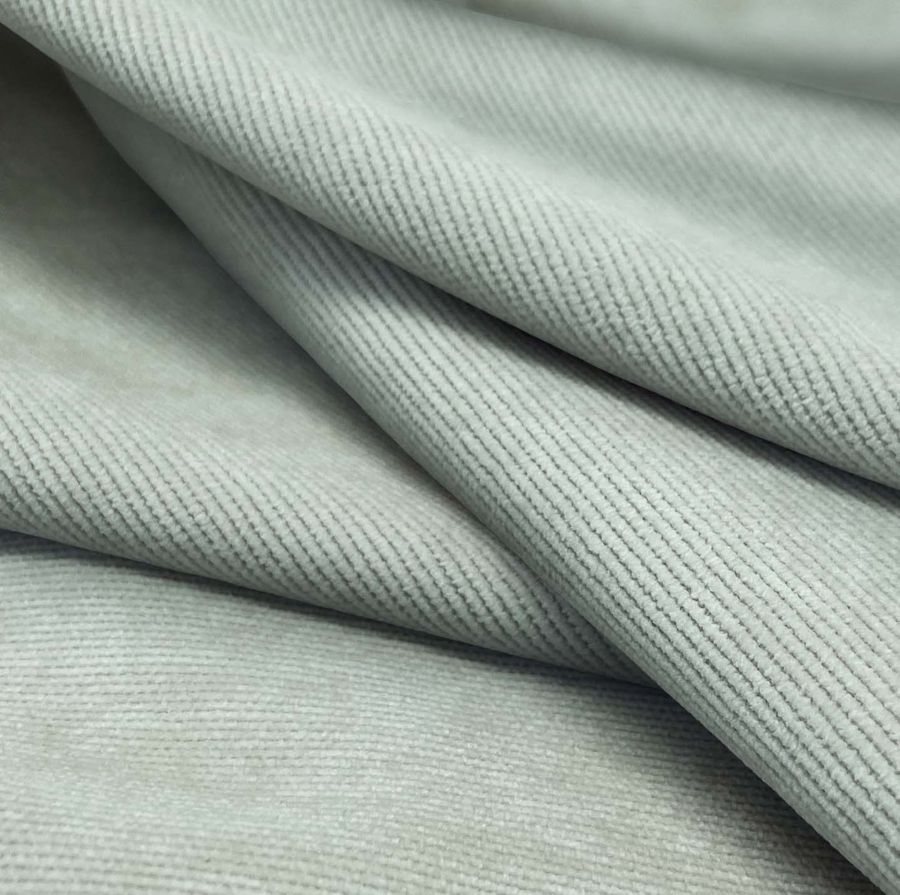 La tela base es la Pana Aterciopelada - Dublin, con una composición de 85% poliéster, 12% poliamida y 3% elastano, con un gramaje de 280 gr/m2 y un ancho de 150 cm. El color liso impreso es azul bebé, con una combinación CMYK de 33 13 24 1. Este color evoca tranquilidad y serenidad, ofreciendo una sensación de frescura y suavidad. Combina particularmente bien con tonos marrones y grises. Es importante destacar que la tela está impresa solo en una cara mediante impresión digital textil.