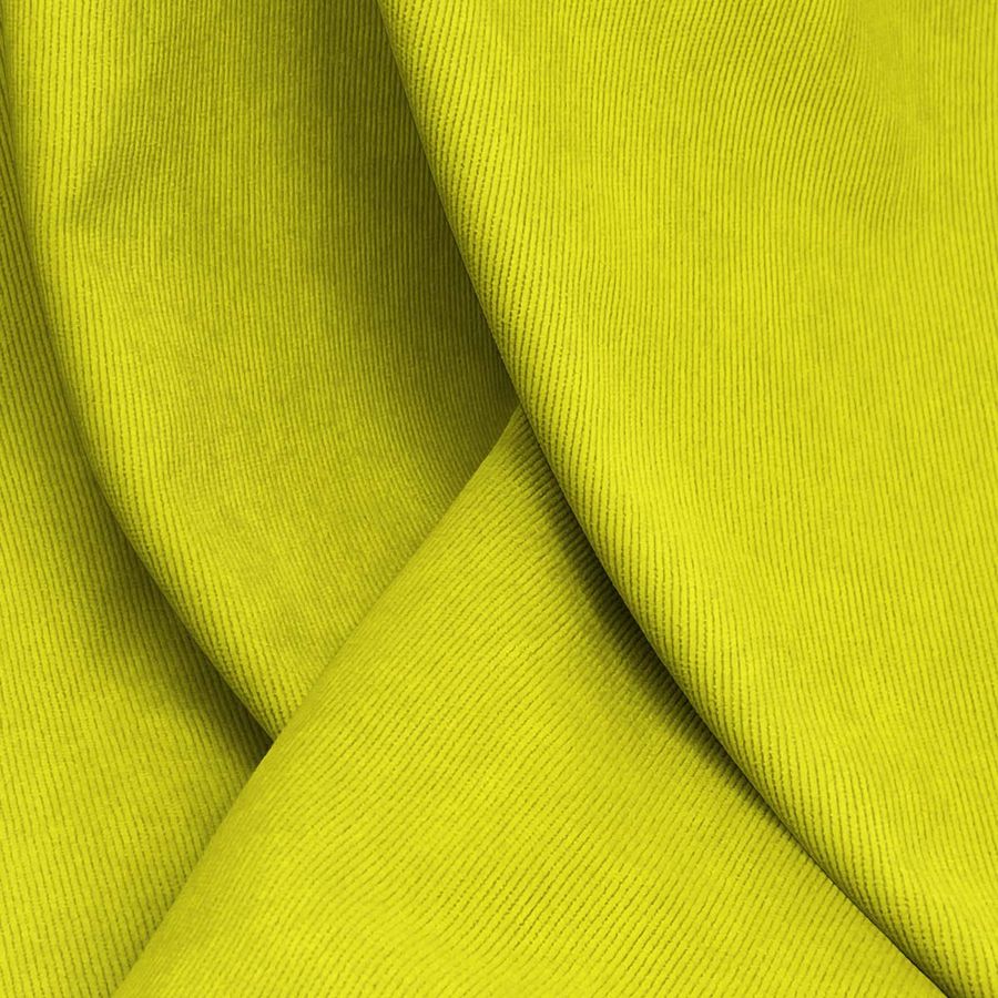 La tela base de este producto es la Pana Aterciopelada - Dublin, una pana compuesta por 85% de poliéster, 12% de poliamida y 3% de elastano. Su gramaje de 280 gr/m2 le otorga una gran solidez y resistencia. El ancho de la tela es de 150 cm y su color liso impreso es verde camaleón, con un CMYK de 23 4 94 0. Este color presenta una textura visual brillante y un tacto suave. Combina perfectamente con colores tierra, marrones y ocres.