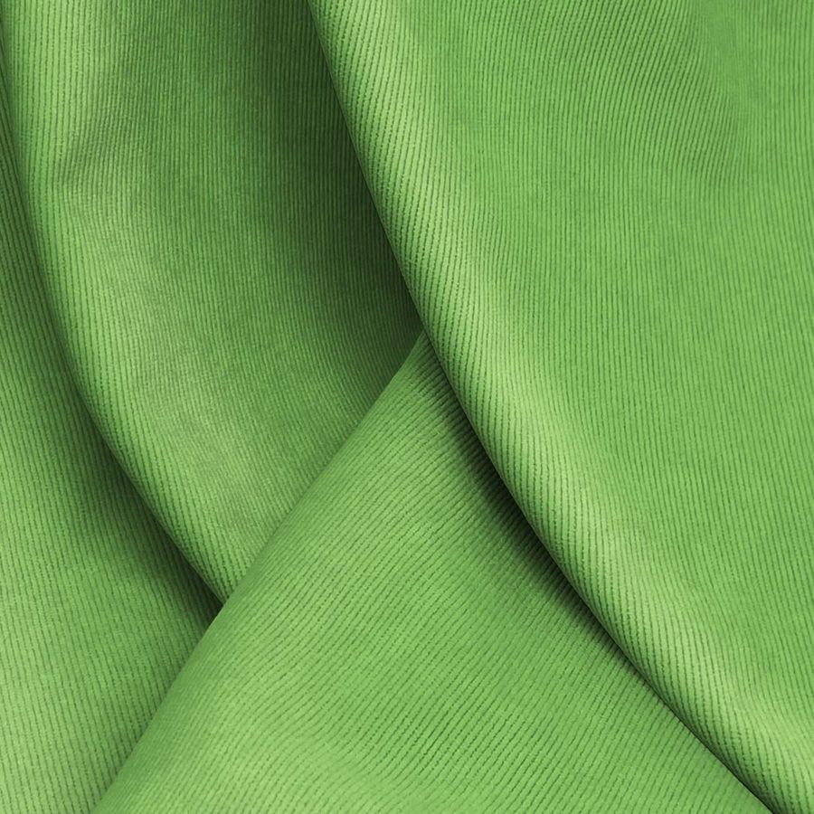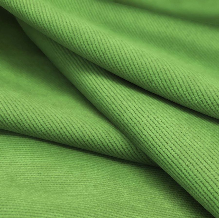 La tela base de esta prenda es la Pana Aterciopelada - Dublin, compuesta de un 85% de poliéster, un 12% de poliamida y un 3% de elastano. Su peso de 280 gr/m2 y su ancho de 150 cm la convierten en un tejido resistente y maleable. El color liso impreso es un verde alga, cuyo CMYK es 63 11 84 1, el cual representa la naturaleza y la tranquilidad. Además, este color es versátil y combina perfectamente con marrones, dorados y grises.
