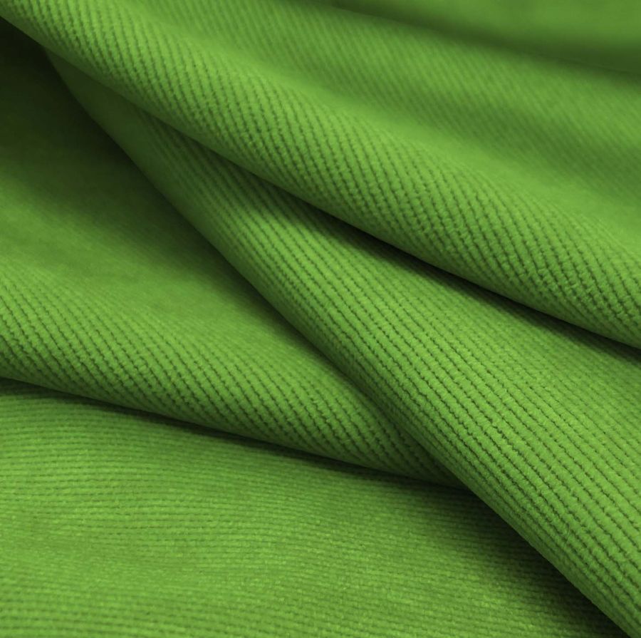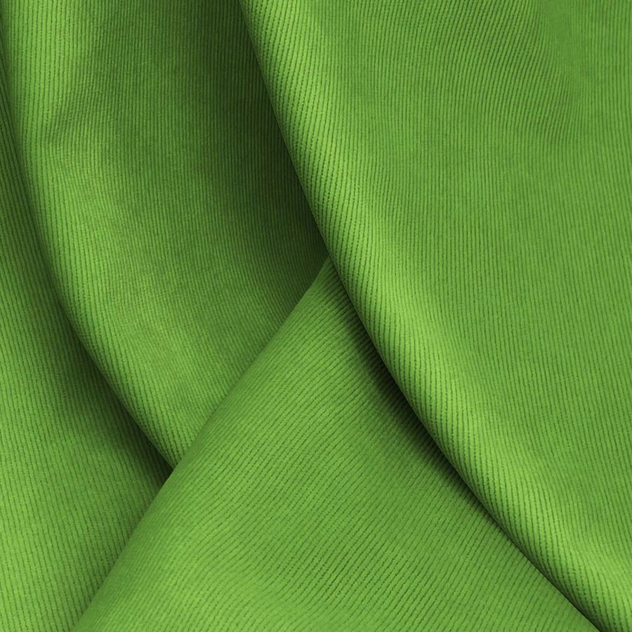 La tela base de esta descripción es la Pana Aterciopelada Dublin, con una composición de 85% poliéster, 12% poliamida y 3% elastano, un gramaje de 280 gr/m2 y un ancho de 150 cm. El color liso impreso en la tela es un verde alga, con unos atributos de tinta CMYK de 69 24 98 8. Este color destaca por su profundidad y elegancia, transmitiendo calma y naturaleza a la vez. Combinado con tonos grises claros, ocres y beiges, crea un ambiente armónico y acogedor.