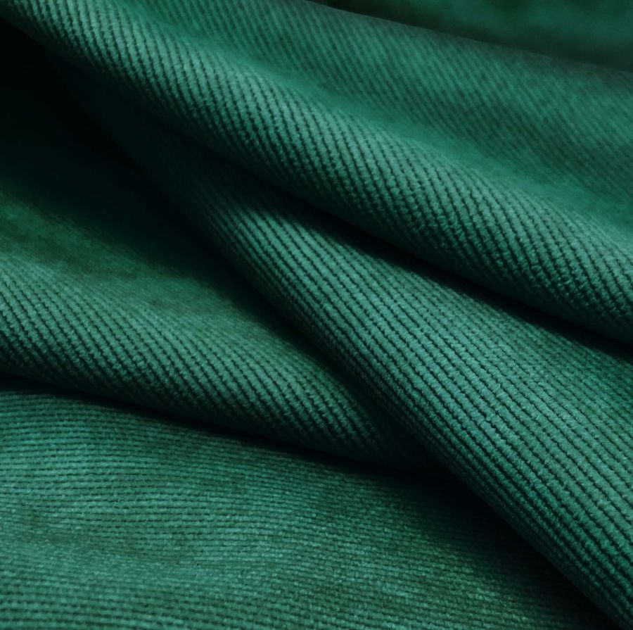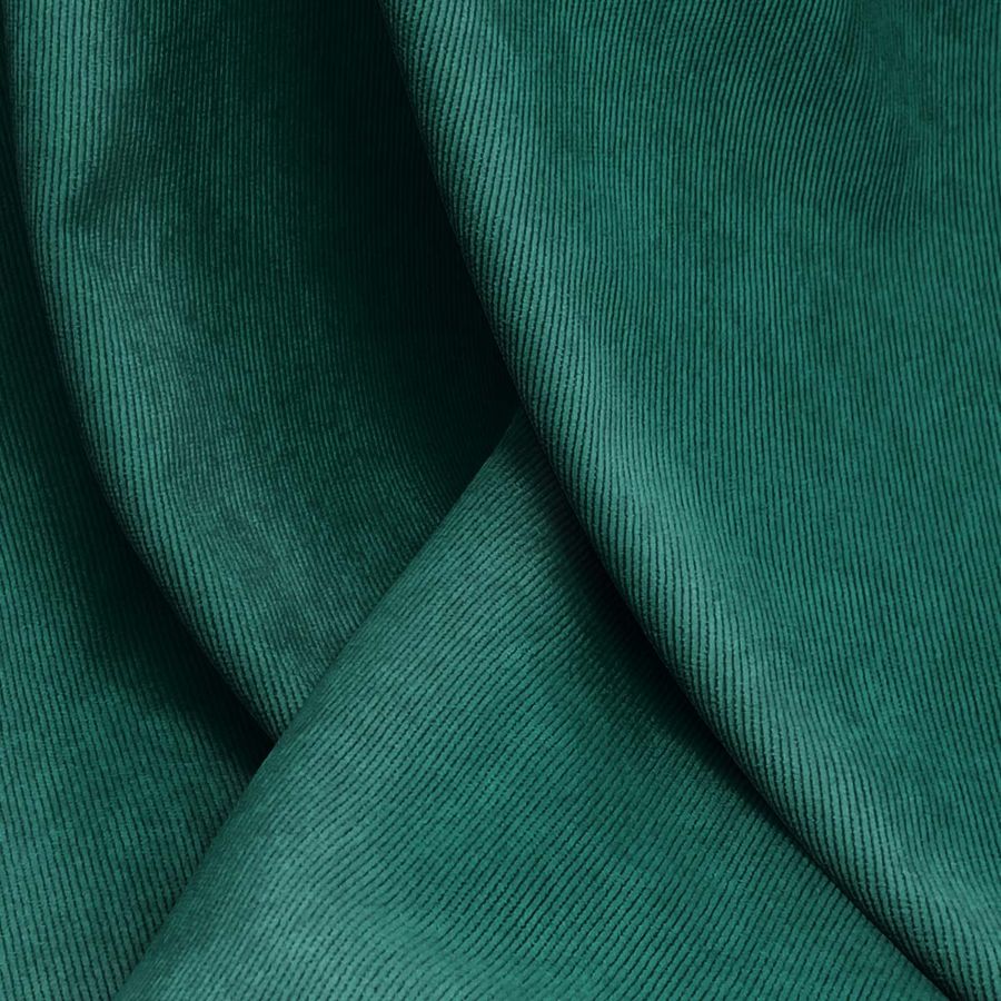 La tela base es una Pana Aterciopelada Dublin, compuesta por 85% POLIÉSTER, 12% POLIAMIDA y 3% ELASTANO, con un gramaje de 280 gr/m2 y un ancho de 150 cm. El color impreso es un tono verde oscuro con toques de Teal profundo, con un CMYK de 92 44 69 54. El color resulta ser símbolo de la naturaleza en su lado oscuro y técnico por su combinación en la impresión digital textil. El Teal profundo, es una mezcla entre el verde azulado y el azul verdoso, que se encuentra en las profundidades del océano. Combina muy bien con otros colores oscuros como el negro, marrón, gris, y otros tonos de verde. El tejido está impreso con el color liso en una sola cara por impresión digital textil, lo que consigue que el color sea vibrante y duradero en el tiempo.