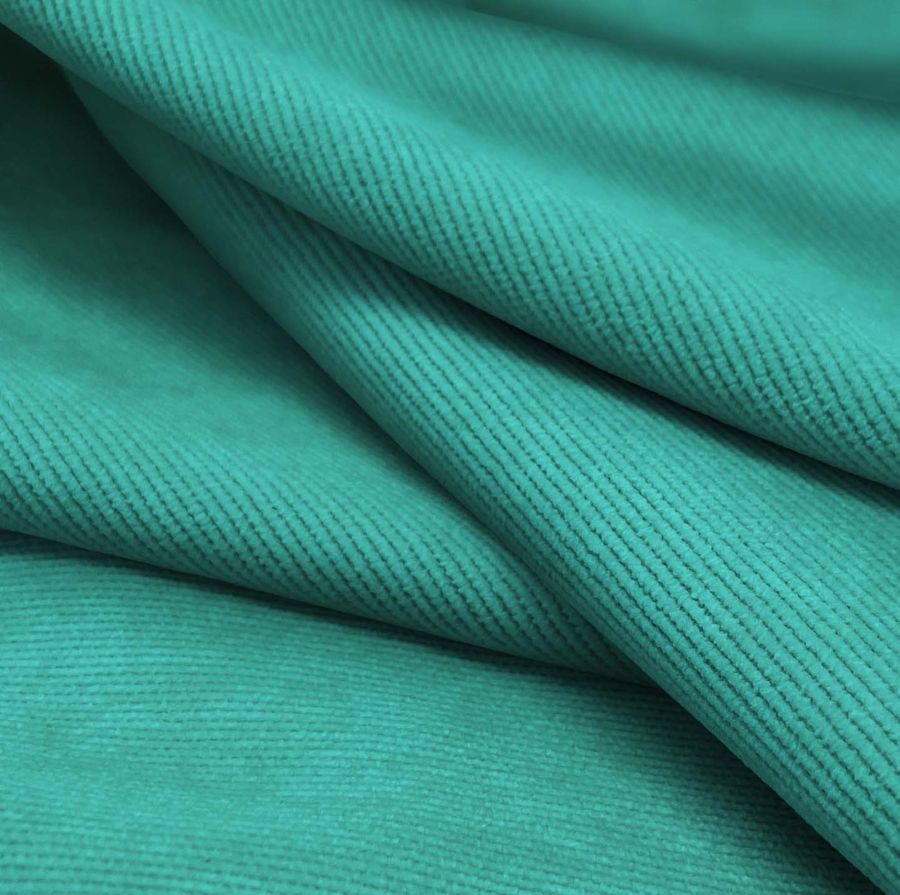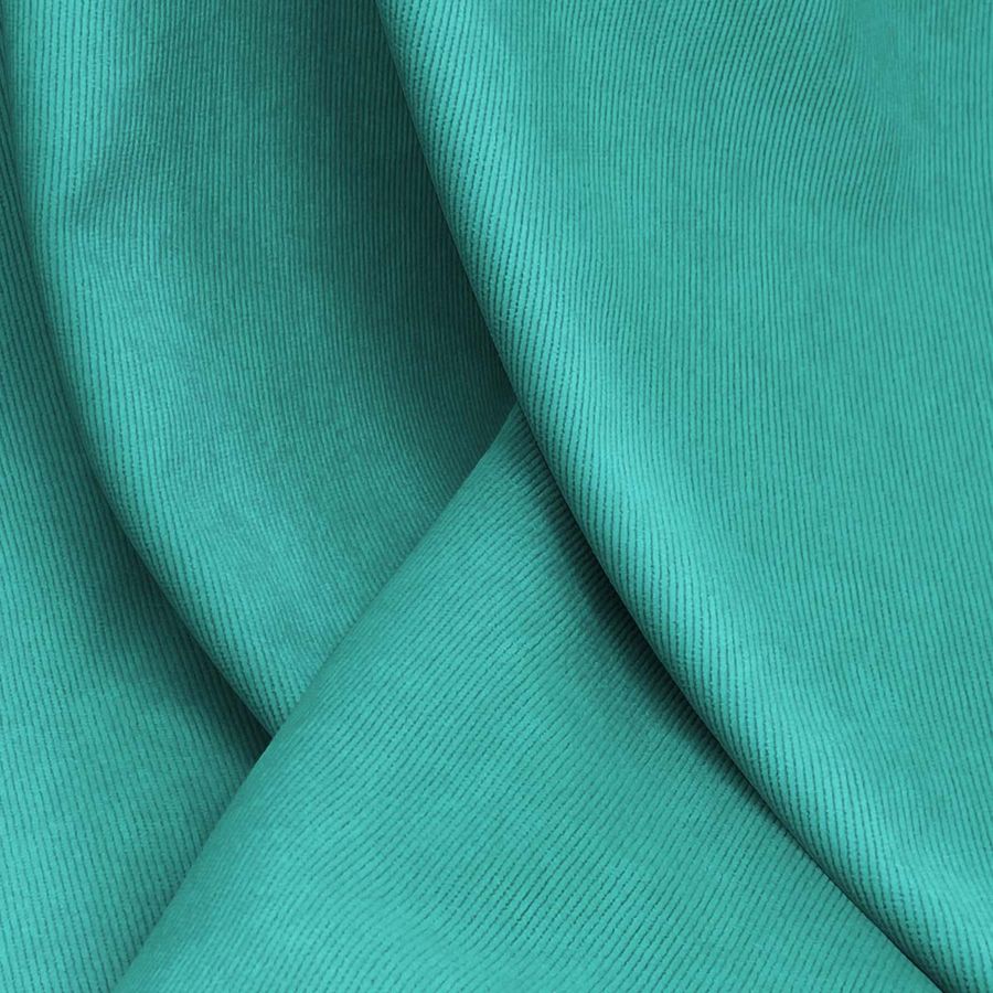 La tela base, Pana Aterciopelada - Dublin, tiene una composición de 85% poliéster, 12% poliamida y 3% elastano con un gramaje de 280 gr/m2 y un ancho de 150 cm. El color liso impreso es Verde Espuma de mar con un CMYK de 75 16 47 2. Este color evoca la serenidad y la frescura de una brisa marina en verano. Combina especialmente bien con tonos neutros como el beige y el blanco, así como con tonos dorados y plateados.