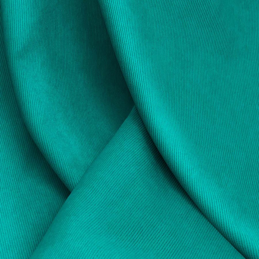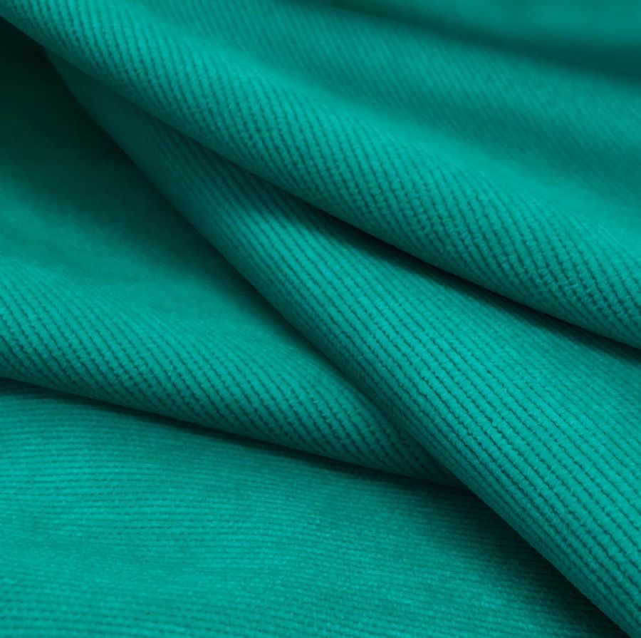 La tela base de esta prenda es la Pana Aterciopelada - Dublin, compuesta principalmente por poliéster y poliamida. El color liso impreso es una mezcla entre verde y verde azulado, de acuerdo con su CMYK de 84 25 53 9. Este color simboliza la naturaleza y evoca la calma y el equilibrio. Combina bien con tonos tierra y marrones oscuros.