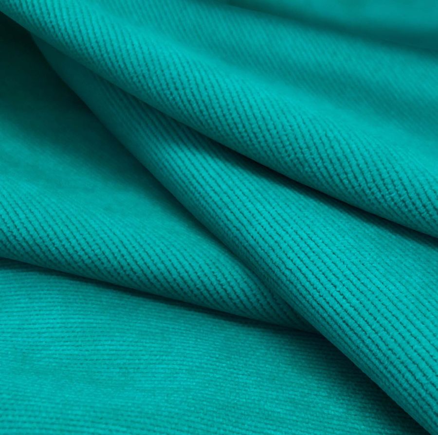 La tela base de este tejido se trata de una pana aterciopelada de composición 85% poliéster, 12% poliamida y 3% elastano, con un gramaje de 280 gr/m2 y un ancho de 150 cm. El color liso impreso es de un verde oscuro, específicamente un DarkCyan, con un CMYK de 80 en tinta Cyan, 19 en tinta Magenta, 42 en tinta Yellow y 4 en tinta Black. Este color es una mezcla entre el azul cian profundo y el verde oscuro, dándole una sensación de profundidad y misterio. Este color combina perfectamente con tonos tierra, dorado o incluso otros verdes oscuros.